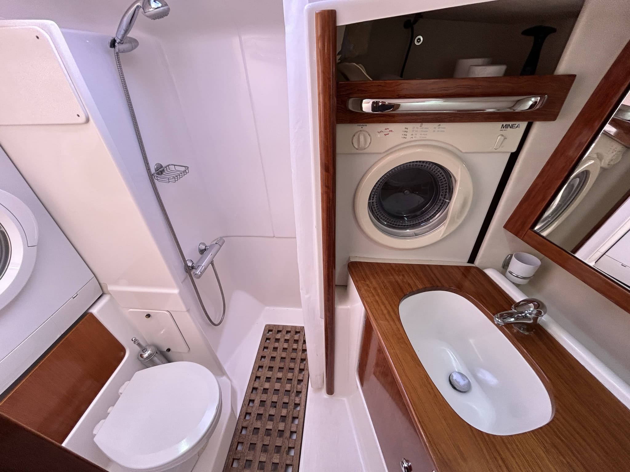 - Salle d’eau avant : Machine à laver BOSCH et machine a sécher le linge, WC électrique avec moteur remplacé en 2022, douche, lavabo, réservoir a eaux noires